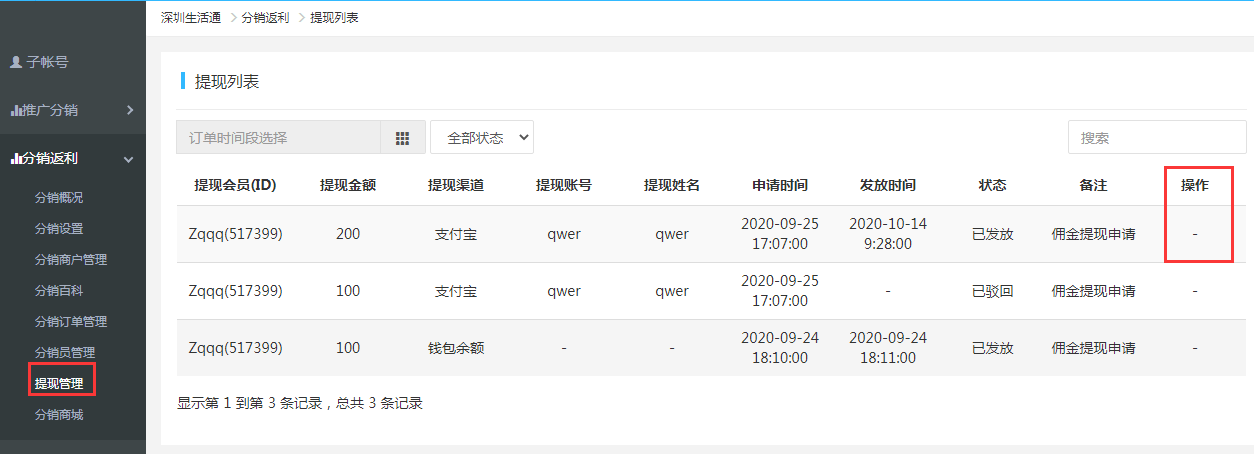 8.提現(xiàn)管理:推廣員提現(xiàn)后在此頁面審核 ,審核通過后需根據用戶提供的帳號私下轉帳,如提現(xiàn)到余額即時到帳(余額是PULS插件的余額用于APP內購買使用)。