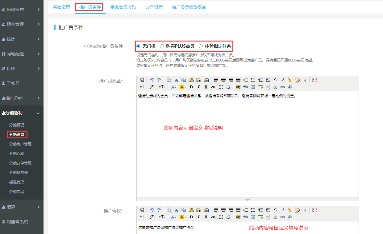 注:1.同城配送店鋪如加入推廣分銷是整個店鋪的產品都參與,不支持按單個產品設置參與分銷,并且商品中設置的餐具金額也參與分擁