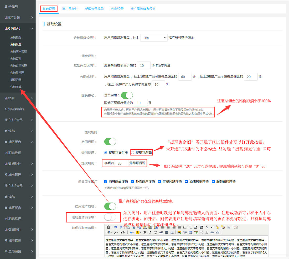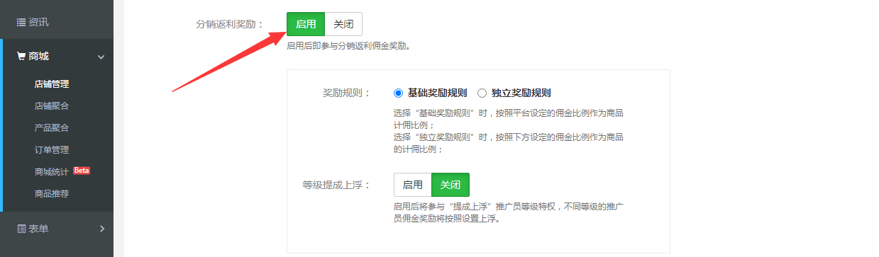 2.“分銷設置”設置推廣員層級和傭金規(guī)則、提現(xiàn)規(guī)則、是否顯示推廣、啟用推廣商城、注冊邀請碼必填及如何獲取邀請碼等設置。設置完成后,對應在錄入新商品時,可設置“傭金獎勵”的啟用/關閉。