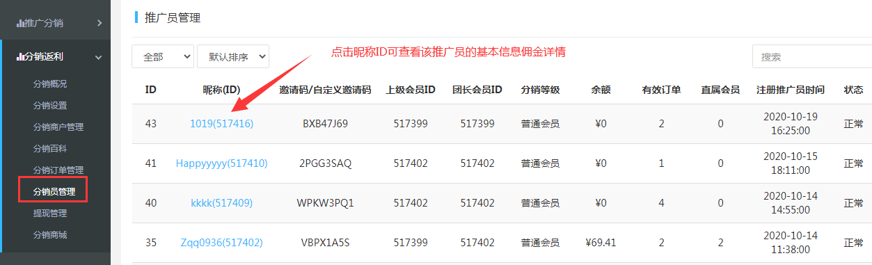 7.推廣員管理:推廣員的基本信息,點擊ID可查看推廣員的基本信息、收益信息記錄等情況 。可設置推廣員的“自定義邀請碼”, 編碼的字數需要在4-8個字符之間(不可超8個字符)。