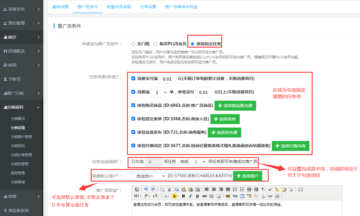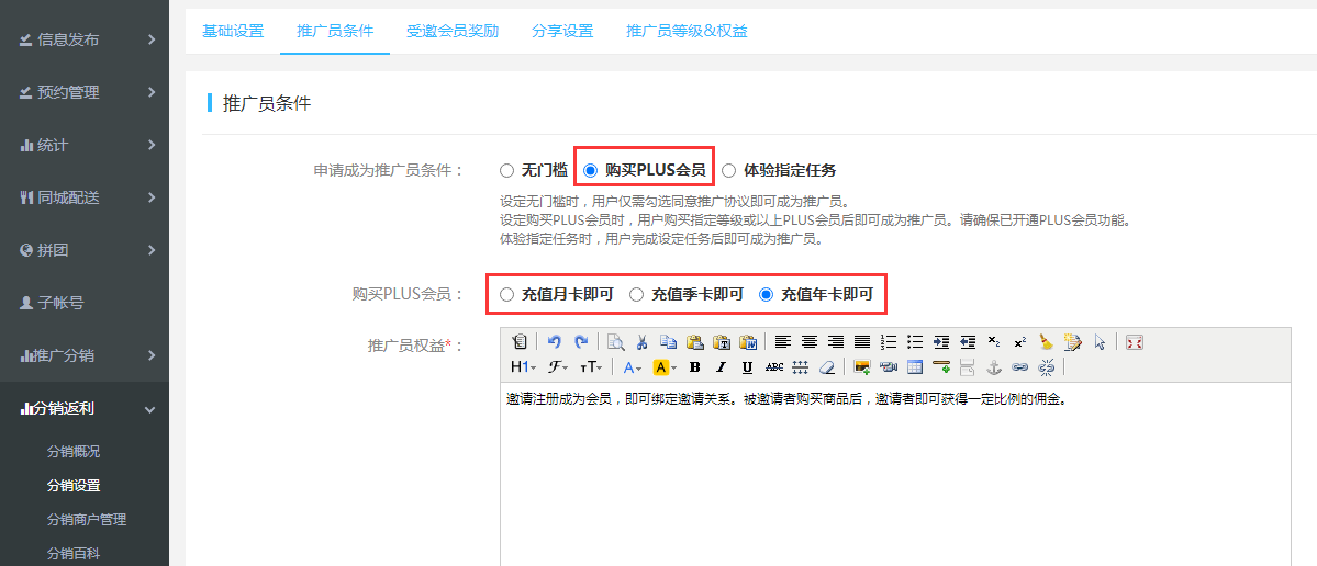 3.“推廣員條件”設置,可勾選其中一設置限制:無門檻、購買PLUS會員、體驗指定任務