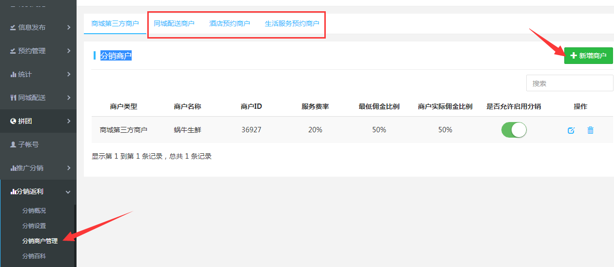 4.分銷商戶:平臺里的自營店鋪是默認參與的,如果第三方店鋪及其它的店鋪需要參與分銷需要另外添加。(同城配送、酒店預約、生活服務預約商戶是插件需另外付費購買才可使用添加)