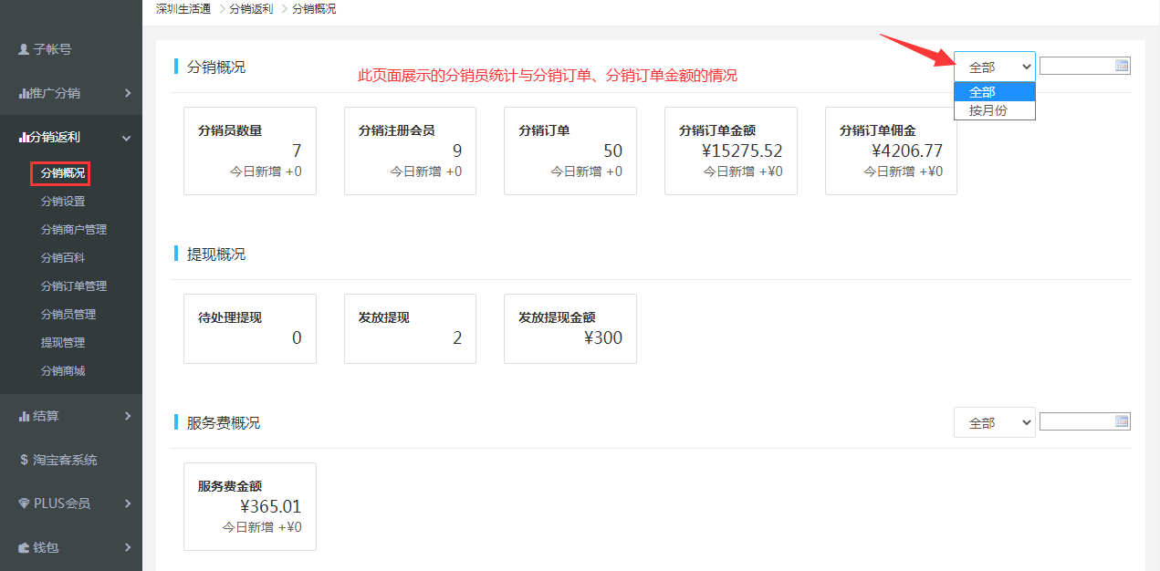 1.進入運營管理平臺,點擊后臺選擇“分銷概況”,概況展示的是分銷返利經營的數據,右上角可選擇按不同月份查看數據。