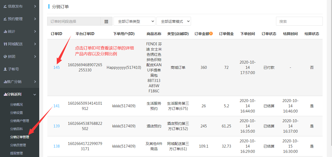 6.分銷訂單:所有訂單里有包含參與分銷的訂單在這里都有相關記錄。(金額:不包含郵費配送費以及退款金額)