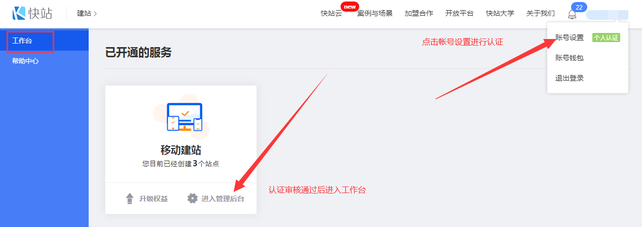需在快站平臺注冊帳號并認證,進入工作臺認證可認證個人或者公司,認證成功后進入管理后臺。(認證資料提交成功后可直接聯(lián)系客服說明需要購買業(yè)務讓其快速審核)