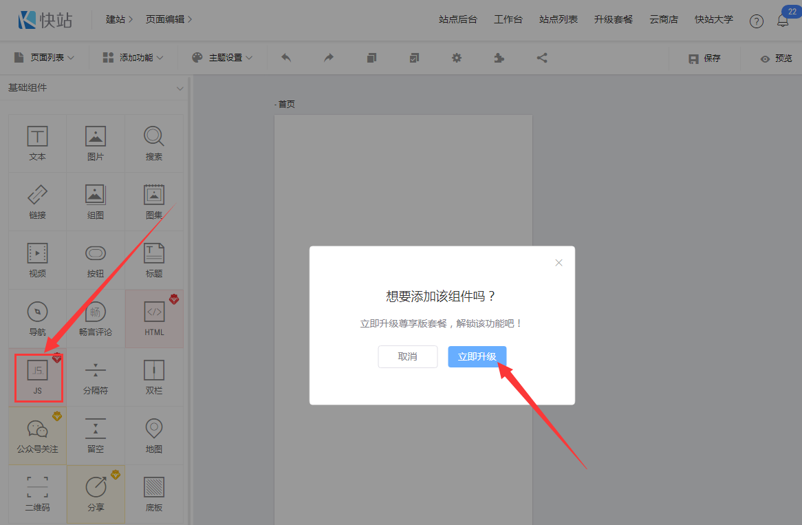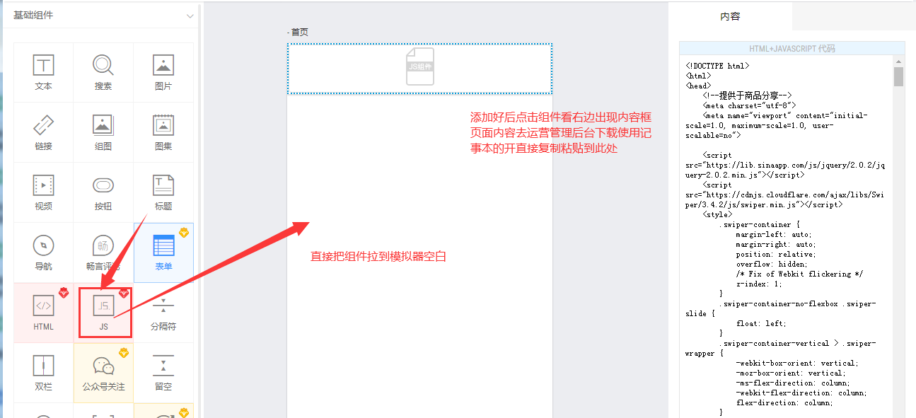 進入編輯頁面后選擇JS組件,JS組件需要付費購買,需購買尊享版目前價格是1699元/年(價格可能有所變動按快站官網報價為準),購買成功后直接把JS組件拖入到中間模擬器中間空白處,添加成功后點擊組件右邊會出現(xiàn)輸入框添加在應用公園后臺分享頁面下載的文件使用記事本打開直接復制粘貼到此處。