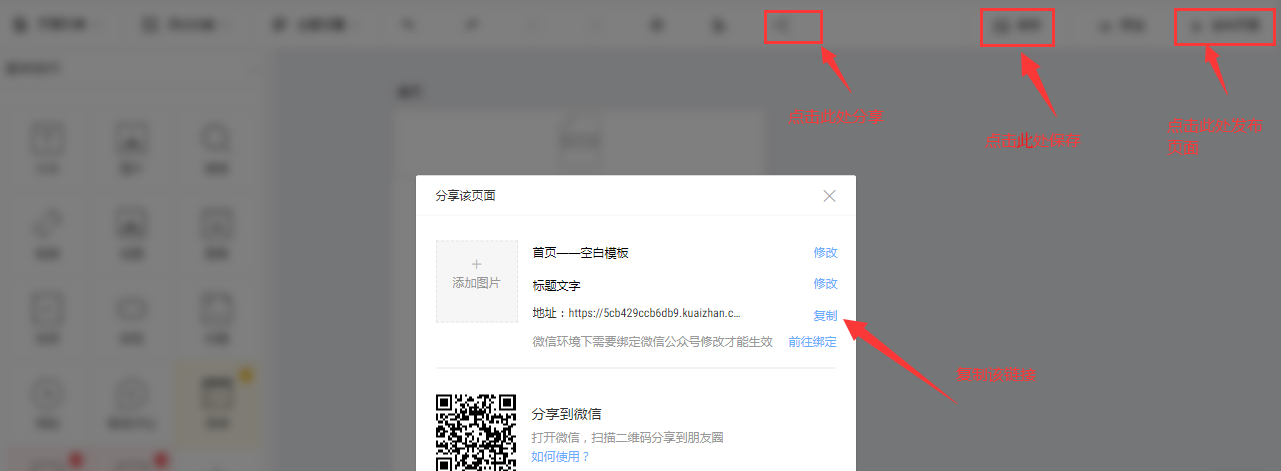 頁面內容設置完成后點擊“保存”、“發(fā)布頁面”后點擊“分享”復制鏈接,把鏈接填寫到應用公園運營管理后臺,分享頁面的“下載頁面網址”處即可