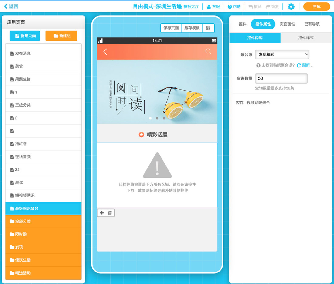 3. 制作頁面在插件中找到“視頻貼吧聚合源”,拖入新建頁面的底部,然后在控件內(nèi)容中綁定聚合源,然后填寫顯示數(shù)量后即可使用,該插件僅支持在頁面最底部使用,下方除了標簽導航外,不支持添加其他插件及控件。