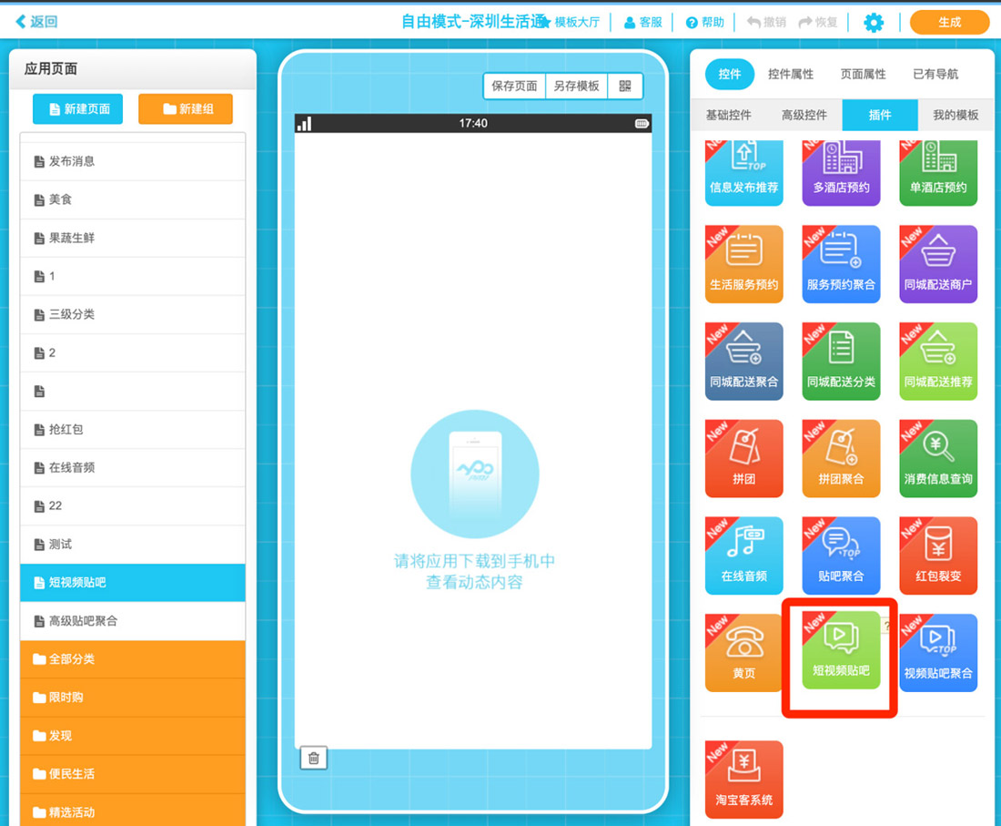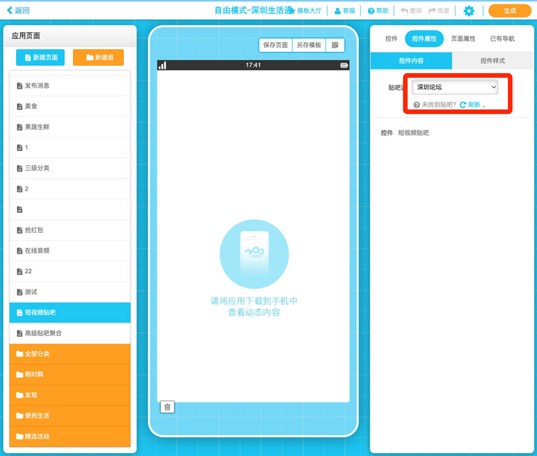 2. 制作頁面新建頁面,然后在插件中找到“短視頻貼吧”,將其拖入模擬器內(nèi),然后在控件內(nèi)容中關(guān)聯(lián)對應貼吧源即可。這樣短視頻貼吧就創(chuàng)建好了,重新生成應用并發(fā)布版本更細即可在手機客戶端查看并使用該功能了。
