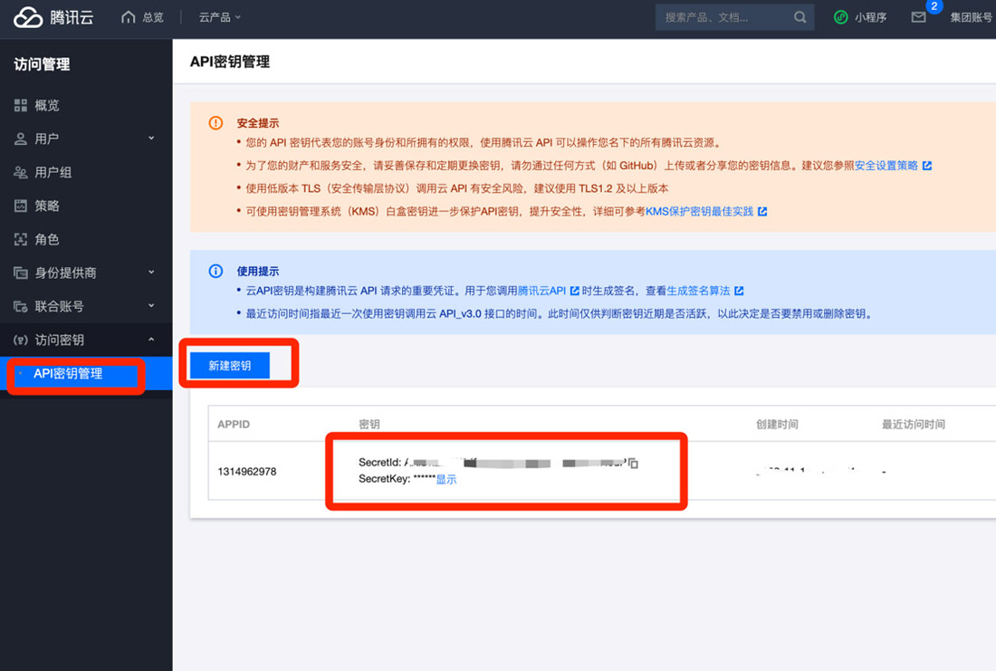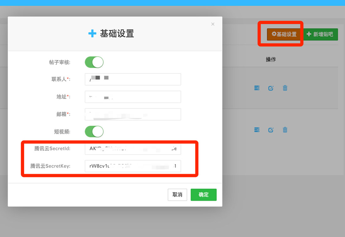 1. 訪問https://console.cloud.tencent.com/cam/capi,點擊新建密鑰,然后在運營管理平臺“貼吧”的“基礎(chǔ)設置”中打開短視頻開關(guān),并將創(chuàng)建成功的密鑰填寫到運營管理平臺貼吧的基礎(chǔ)設置中。