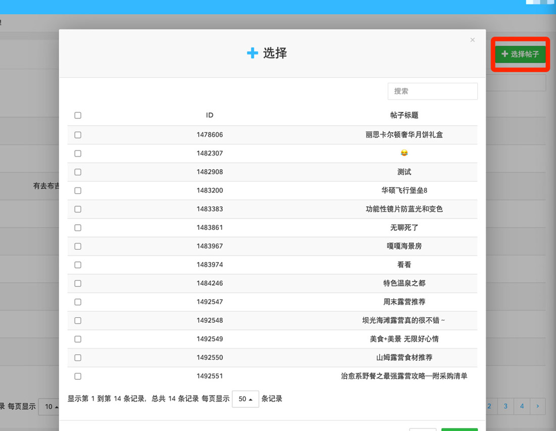2.進入創(chuàng)建好的貼吧聚合源,點擊“選擇帖子”可以將指定的帖子加入該聚合源中,如果覺得手動添加麻煩,可以在貼吧詳情中,點擊“基礎(chǔ)設置”然后將該貼吧的帖子指定自動顯示在綁定的貼吧聚合源中。