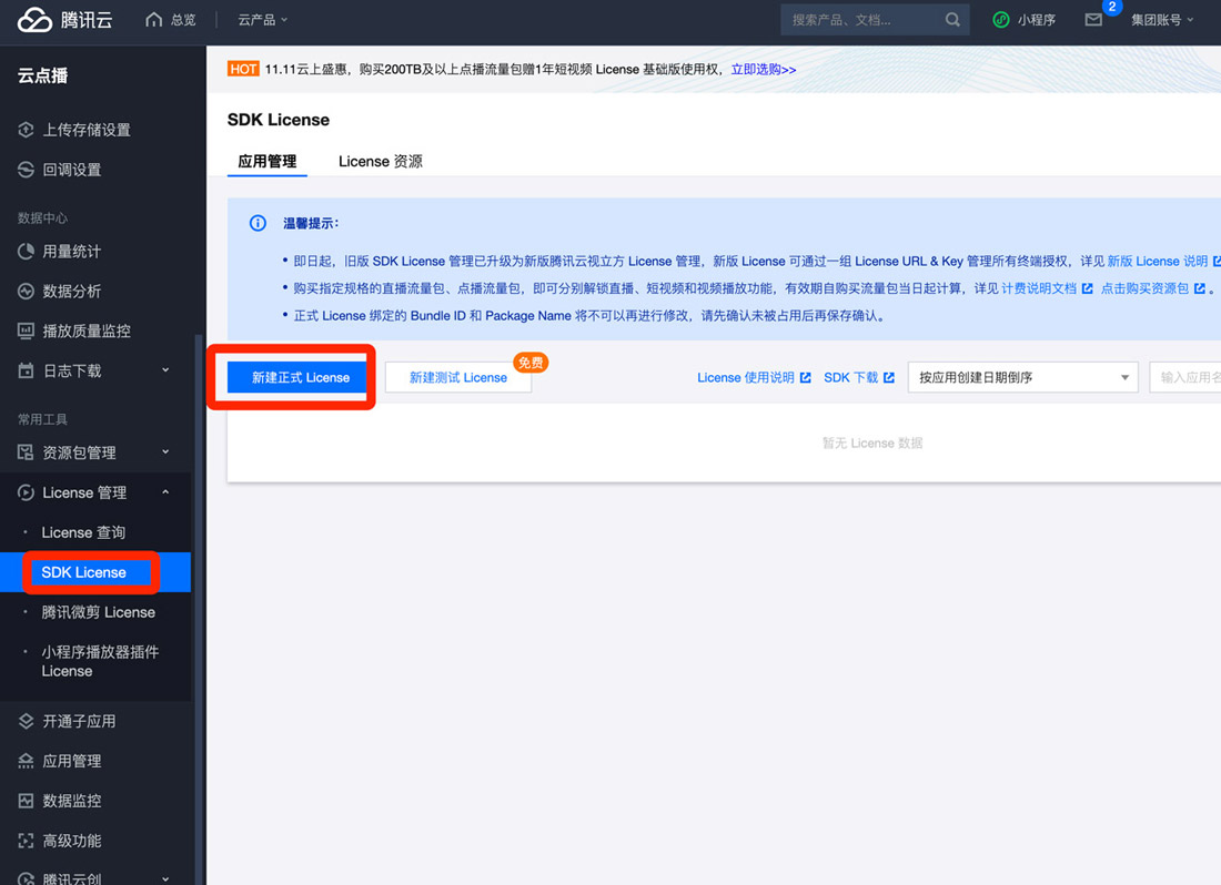 1.登錄https://console.cloud.tencent.com/vod/license/video,選中“license管理—SDK license”,然后點擊“新建正式license”。