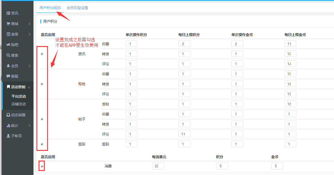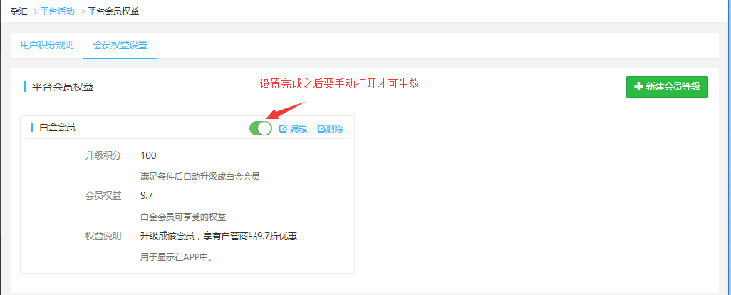 支持平臺會員積分使用累計、以及會員等級設置(達到相應等級可設置享有的折扣優惠),