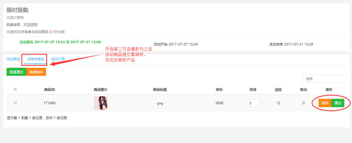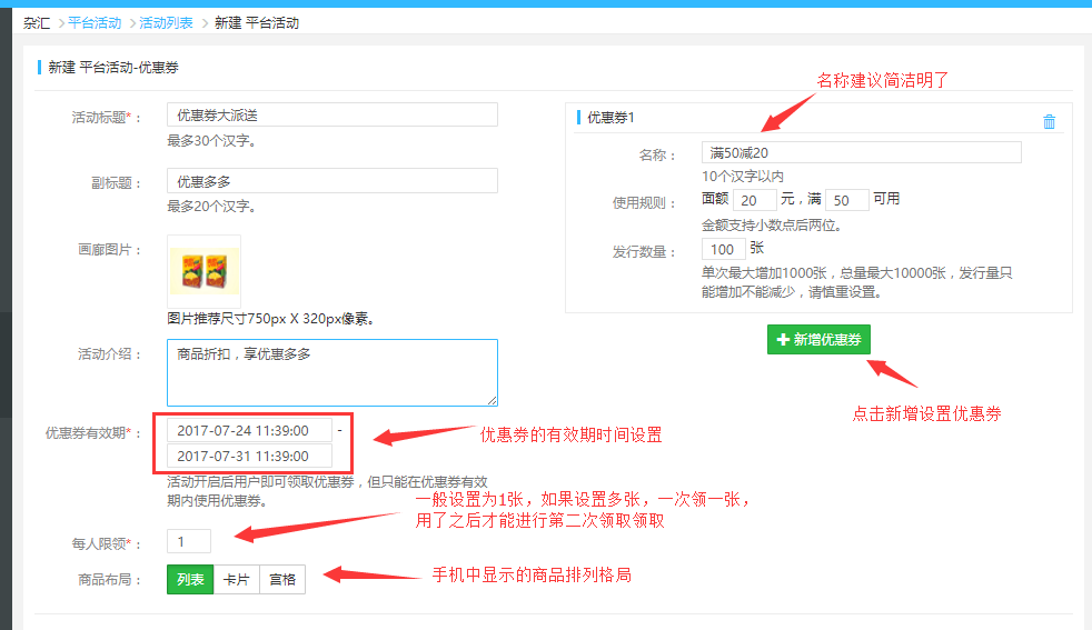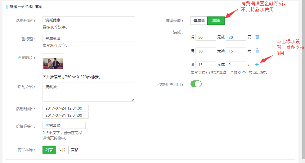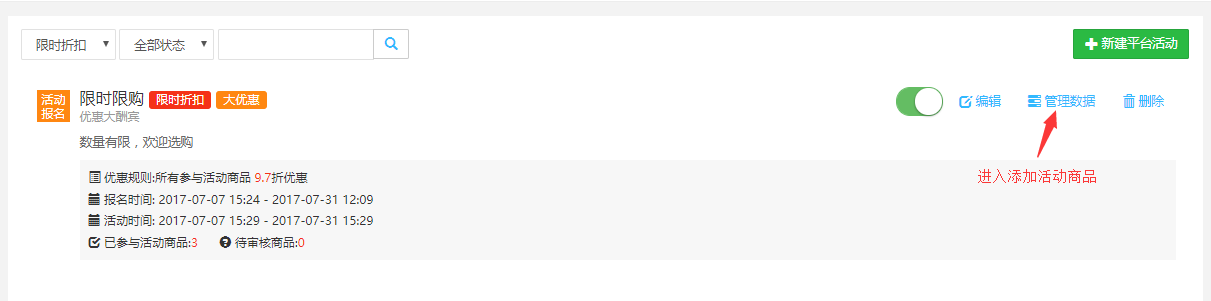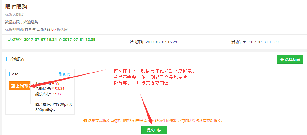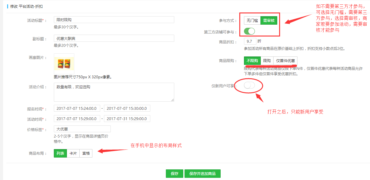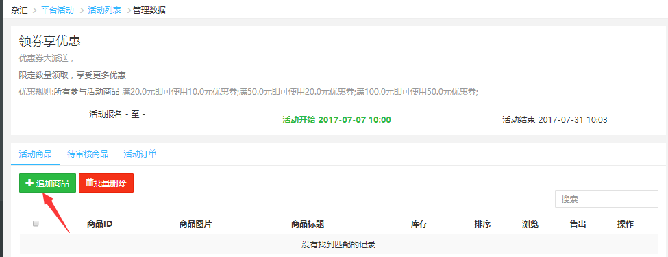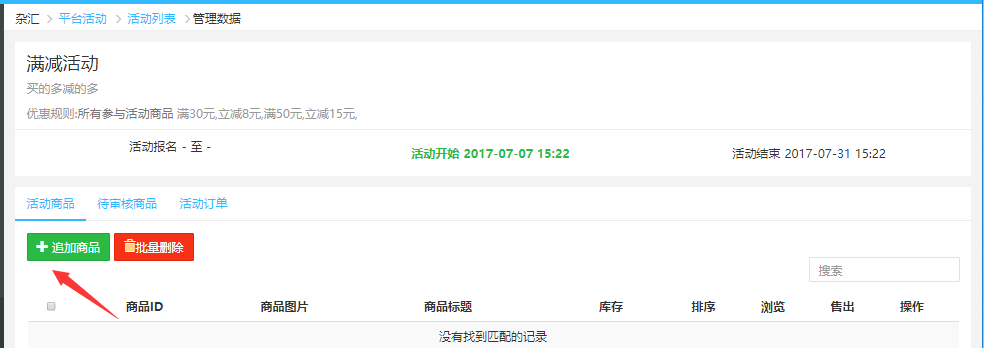 *設置完成之后,點擊“保存”,僅保存并跳轉回活動顯示頁面;點擊“保存并追加商品”會跳轉到添加商品頁面