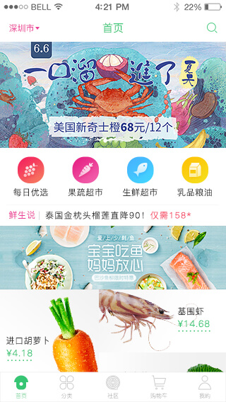 6、LBS位置定位:用戶能夠通過位置定位的功能,定位附近提供生鮮產品服務的商家,或者用戶能夠通過設置相應的搜素范圍,隨時獲得商家的新品上市的信息,及時采購新鮮可口的商品。